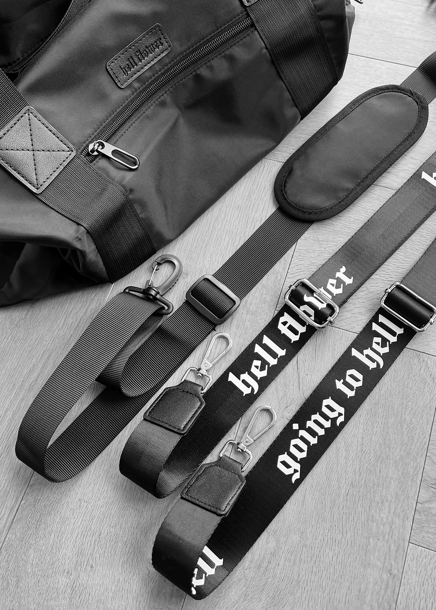 The hell flower soft gym/weekend bag with repeat slogan strap. The large bag comes with both a plain black bag strap & slogan bag strap. Plenty of compartments for handy storage.