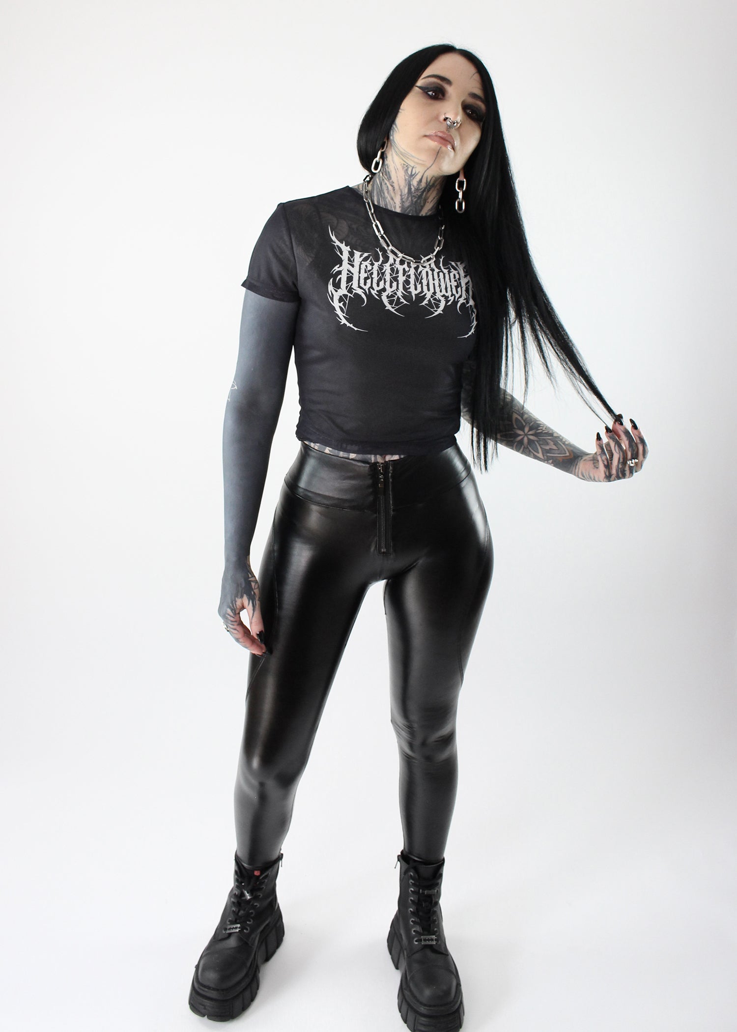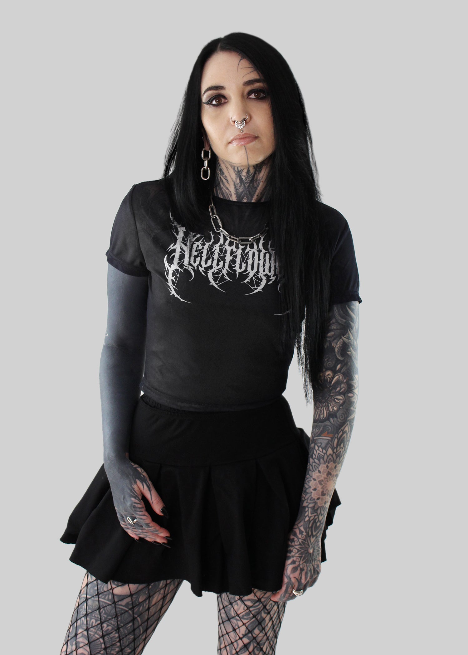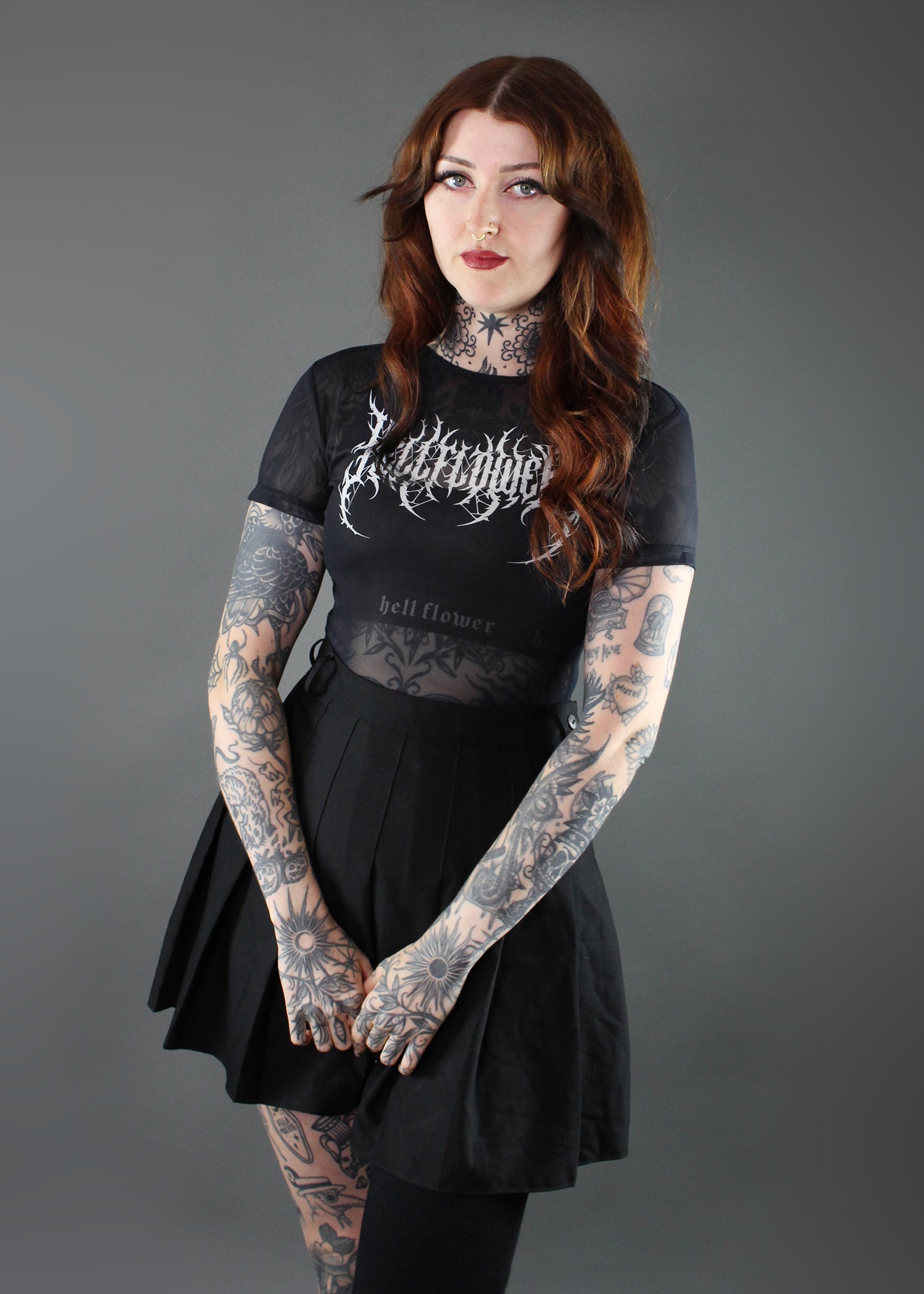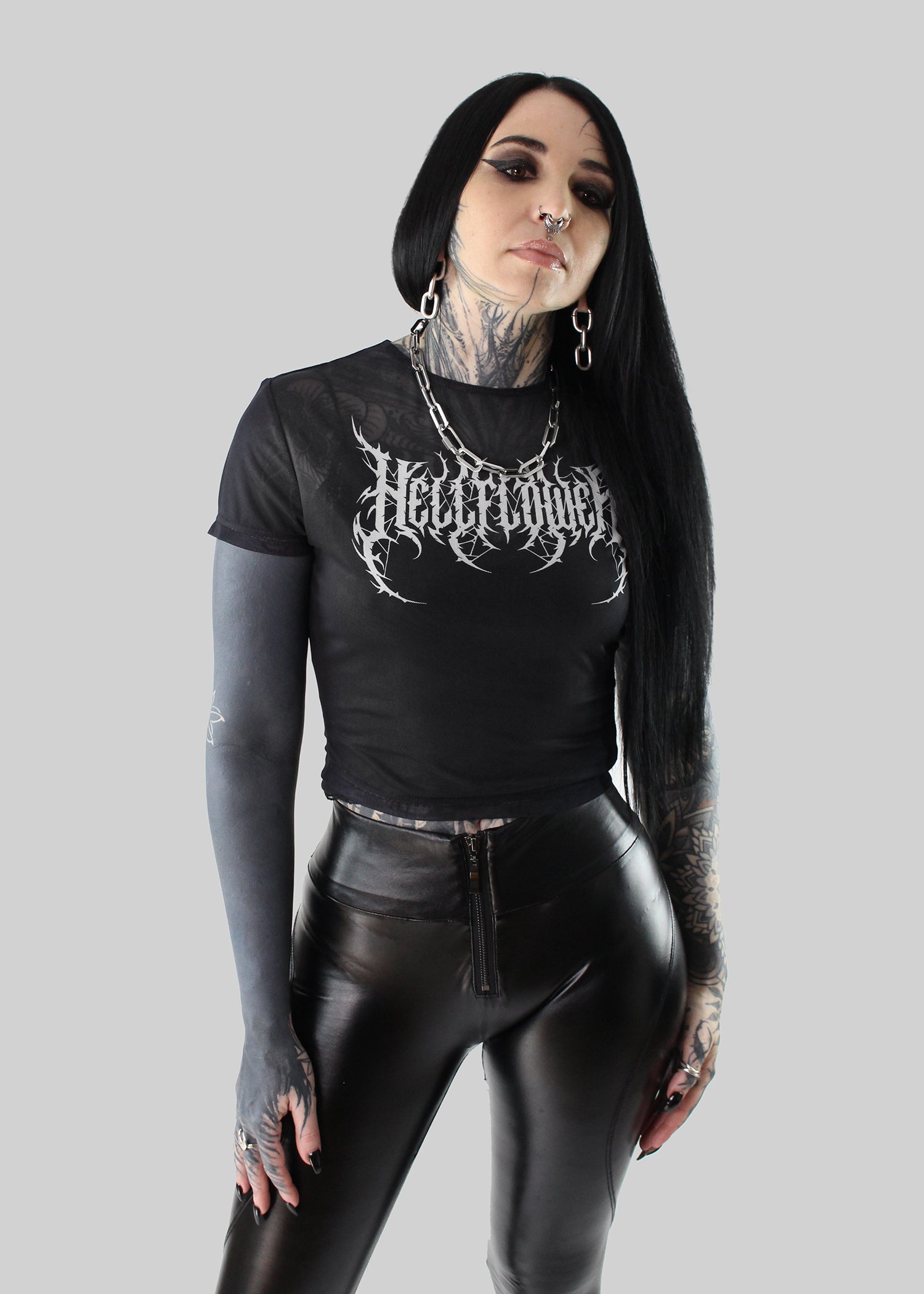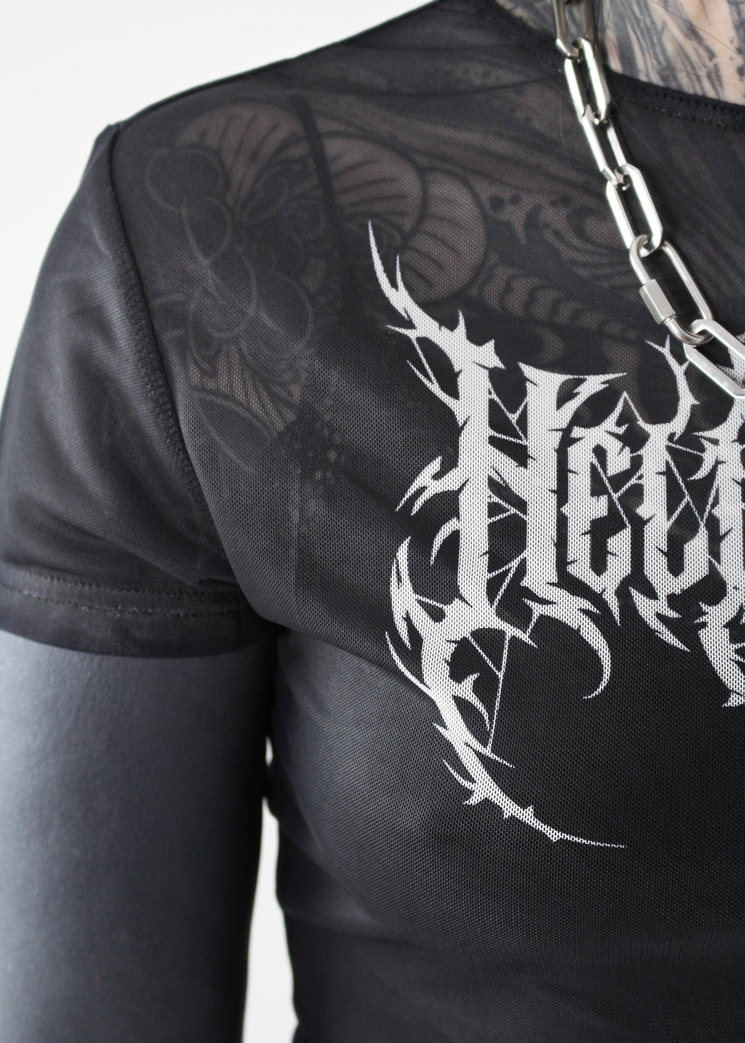 Cropped mesh top with hell flower logo to layer over a bra or cami.
